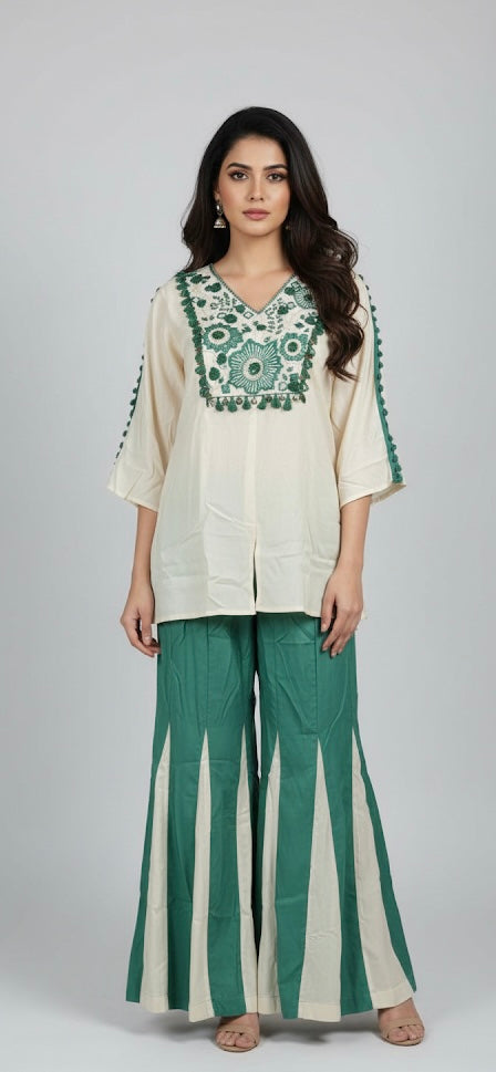 Royal Emerald Cream Thread-Work Kurta With Designer Flared Palazzo